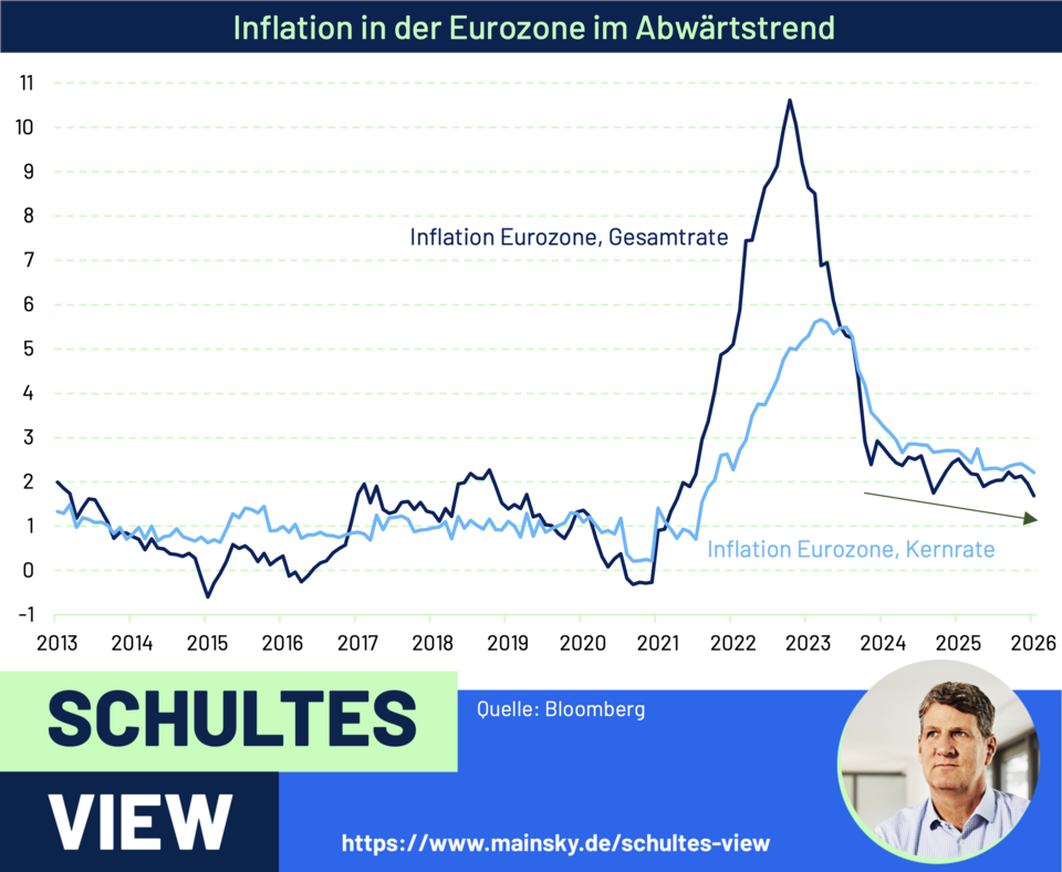 Statt Ruhe zu bewahren und die Entwicklung zu beobachten, sollte sie schnell in die Position für eine weitere Zinssenkung kommen. Mit 1,7 Prozent liegt die Inflation in der Eurozone im Januar bereits unter ihrem Ziel, bis zum Frühsommer erwarten wir einen Rückgang hier auf unter 1,5 Prozent.