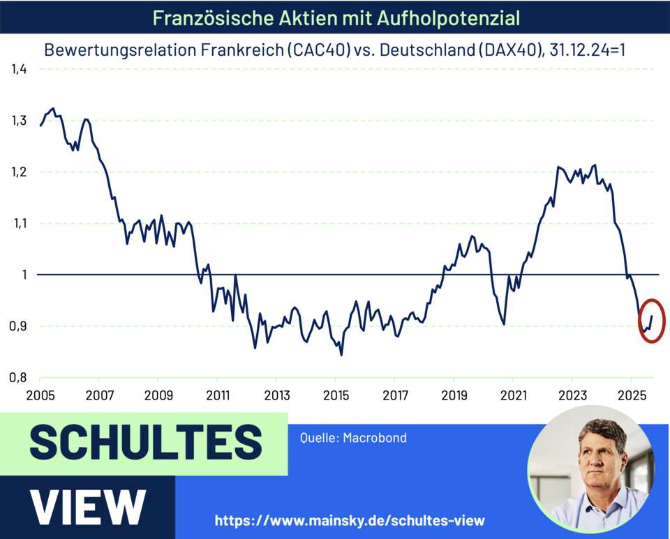 Französische Aktien handeln noch immer mit einem Bewertungsabschlag von 15 Prozent gegenüber deutschen Aktien. Die politischen Unsicherheiten haben den CAC40 gegenüber dem DAX dieses Jahr rund zehn Prozentpunkte underperformen lassen.