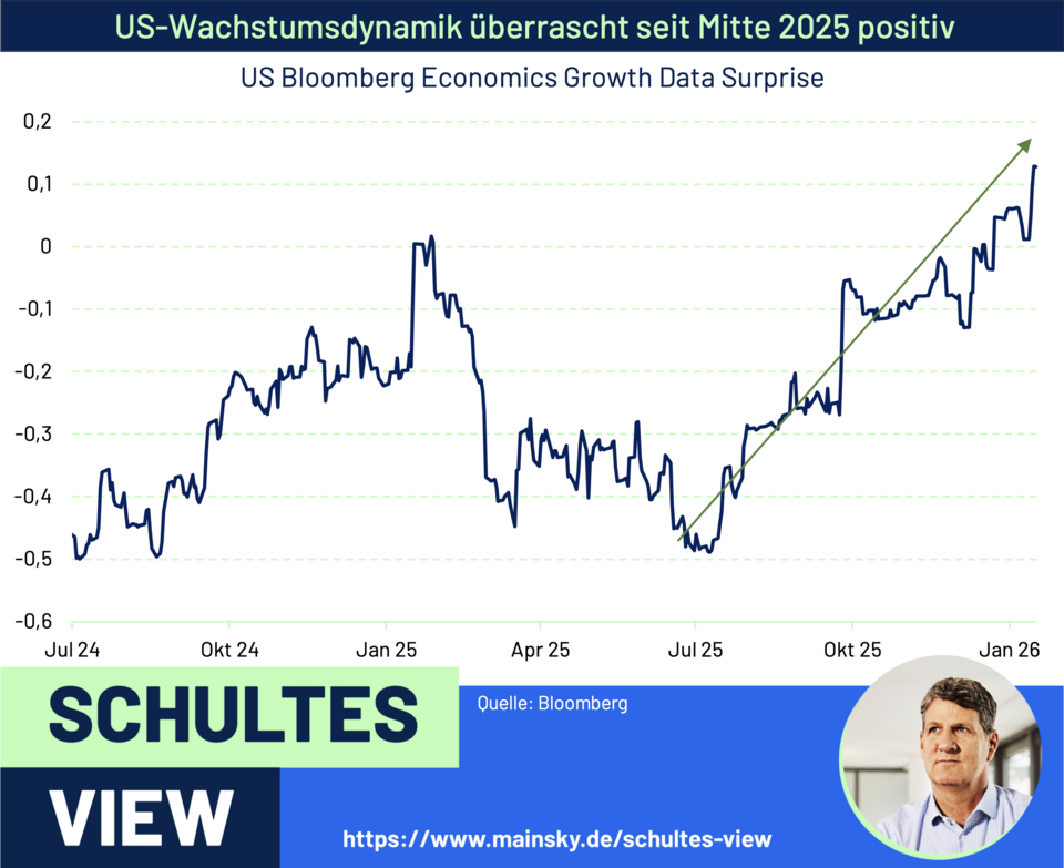 Am deutlichsten zeigt sich diese Dynamik weiterhin in den USA. Daten zu Produktivität und Lohnstückkosten bestätigen erneut unsere seit Langem vertretene These: Die US-Wirtschaft befindet sich in einer Phase eines „disinflationären Produktivitätsbooms“. Noch liegen der Marktkonsens und die Prognose der Fed für 2026 bei einer Wachstumserwartung von rund zwei Prozent. Wir halten eine Rate von über drei Prozent für realistisch, was erneut einem nominalen BIP-Anstieg von fast sechs Prozent entspräche. In den kommenden Wochen dürften viele Banken ihre Prognosen für das US-Wachstum deutlich nach oben revidieren.