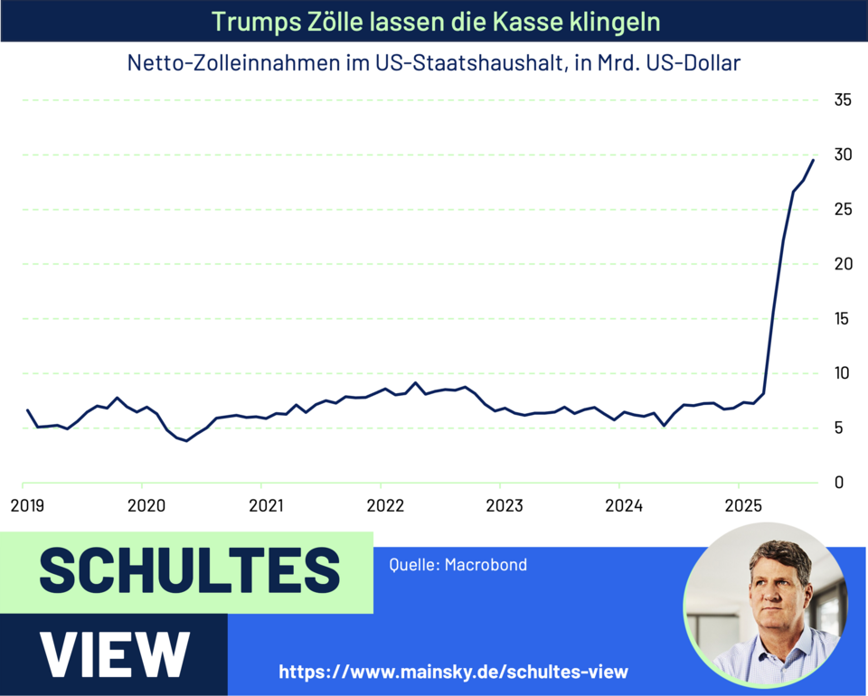Man kann von Donald Trump halten, was man will, aber zumindest in diesem Punkt geben ihm die Zahlen recht. Das US-Finanzministerium hat allein im August fast 30 Milliarden Dollar durch Zölle eingenommen. Und das dürfte nicht das Ende der Fahnenstange gewesen sein. Die von seinem Finanzminister ausgerufenen 500 Milliarden Dollar sind vielleicht in diesem Jahr nicht mehr zu erreichen, aber in den kommenden Jahren sehr wohl. Die Summe entspricht immerhin ca. 1,5 Prozent der Wirtschaftsleistung und die Einnahmen sind auch Grund dafür, dass das Haushaltsdefizit derzeit kleiner wird und sich in Richtung fünf Prozent bewegt.