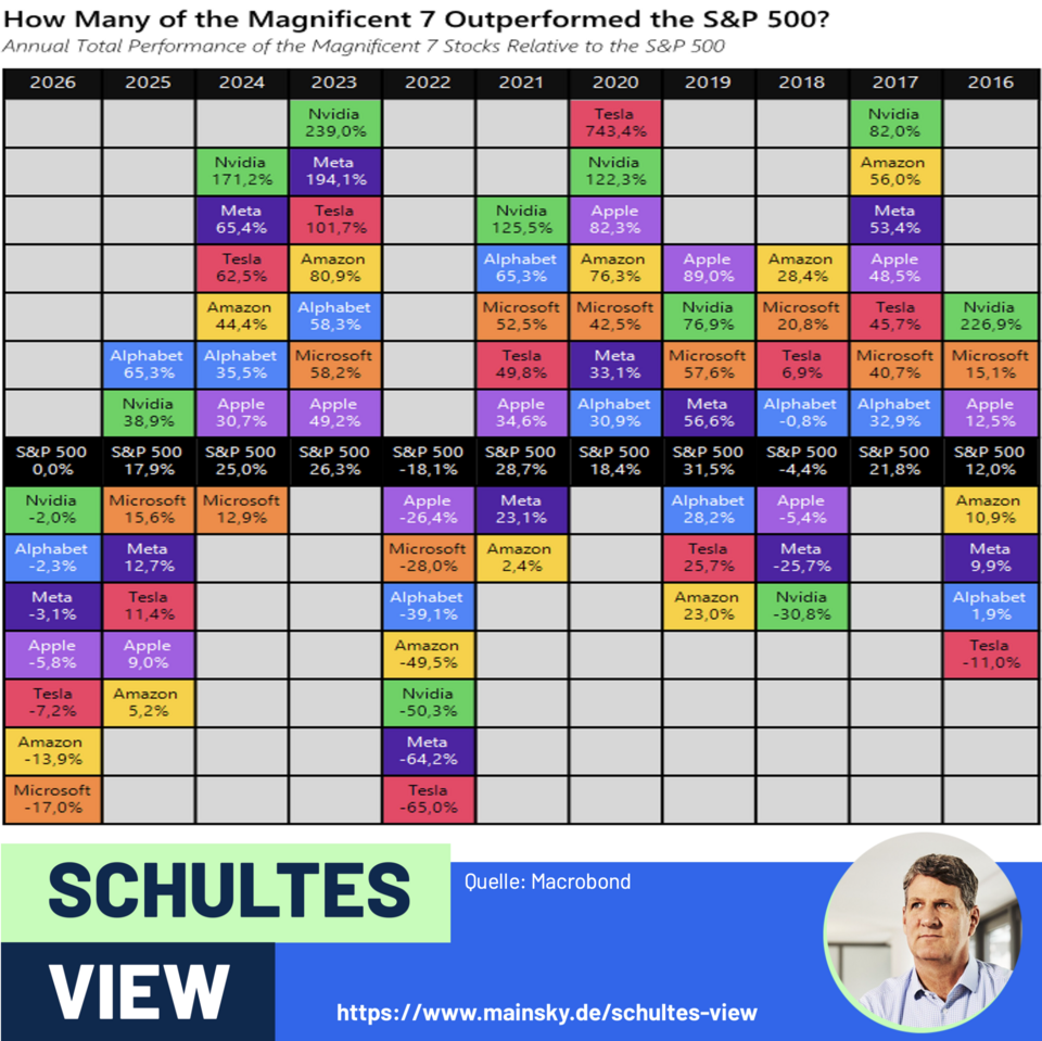Das kommt für Leser von Schultes View nicht überraschend, da wir schon seit Langem argumentieren, dass die MAG 7 nicht mehr das Investment sind, um von der KI-Revolution in den USA zu profitieren.